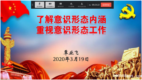 为贯彻落实“三会一课”制度要求,进一步加强意识形态教育,3月19日上午,韦德电竞直属党支部在钉钉会议平台作了“了解意识形态内涵,重视意识形态工作”为题的专题党课,由覃业飞书记主讲,全体党员和入党积极分子聆听了党课。