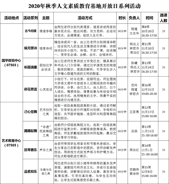 附件:2020年秋季人文素质教育基地开放日系列活动安排见下表
