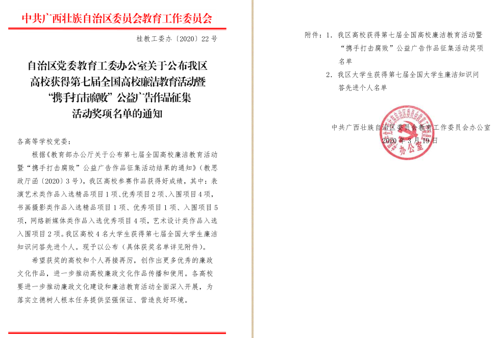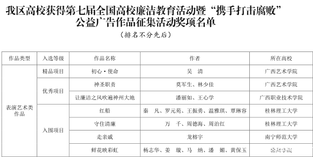 近日,教育部思想政治工作司发布的《教育部办公厅关于公布第七届全国高校廉洁教育活动暨“携手打击腐败”公益广告作品征集活动结果的通知》(教思政厅函〔2020〕3号),我部推送的表演艺术作品《守住清廉》获全国高校廉洁教育活动表演艺术类作品入围奖项1项(全区此类获奖7项)。